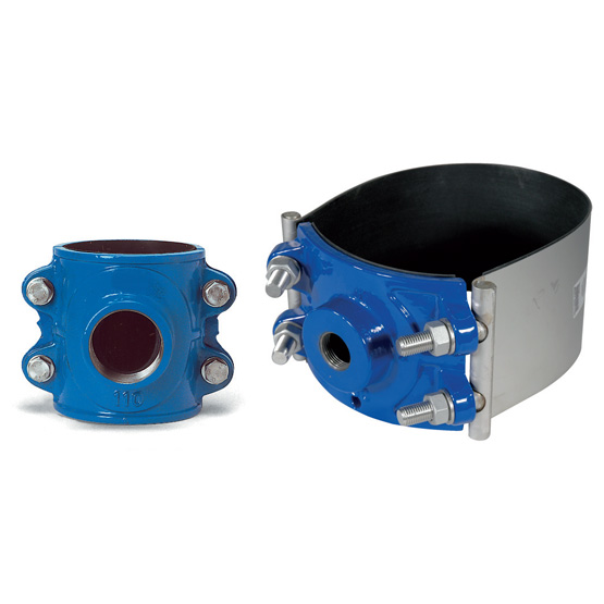 Tapping saddles are easy to mount, maintenance free and designed for long life. A large profiled rubber gasket of drinking water approved EPDM ensures a drop tight seal against a rough pipe surface. The depth of the BSP thread is kept to a minimum to ensure that no raw threads are exposed to the medium once the male thread fitting is mounted. The nuts are located in a recess to prevent them from rotating when tightening the bolts.